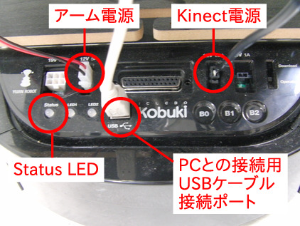 左下のコネクタはに示すTurtlebot背面パネルのアーム電源の場所に差す(では左下の電源装置に相当する).